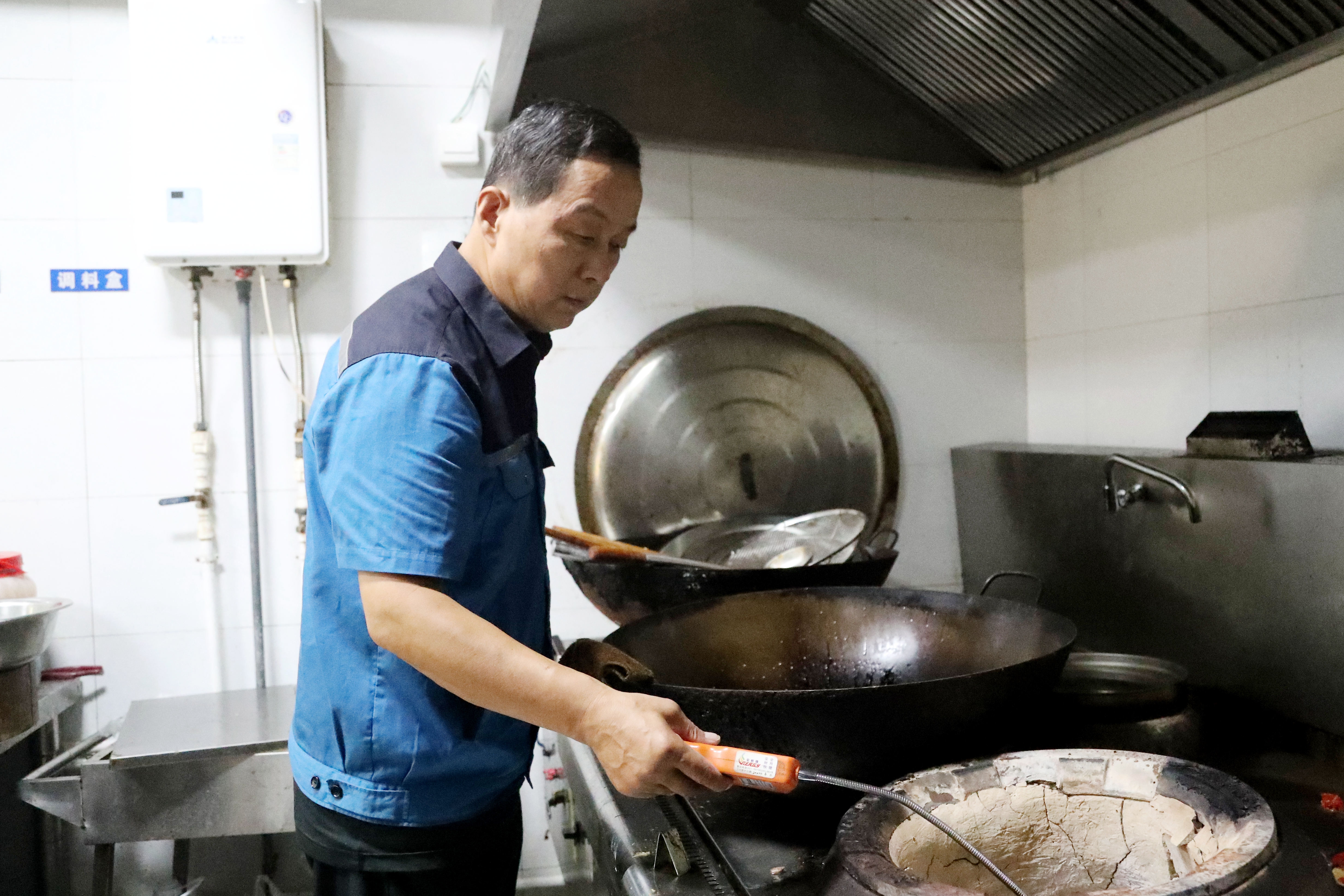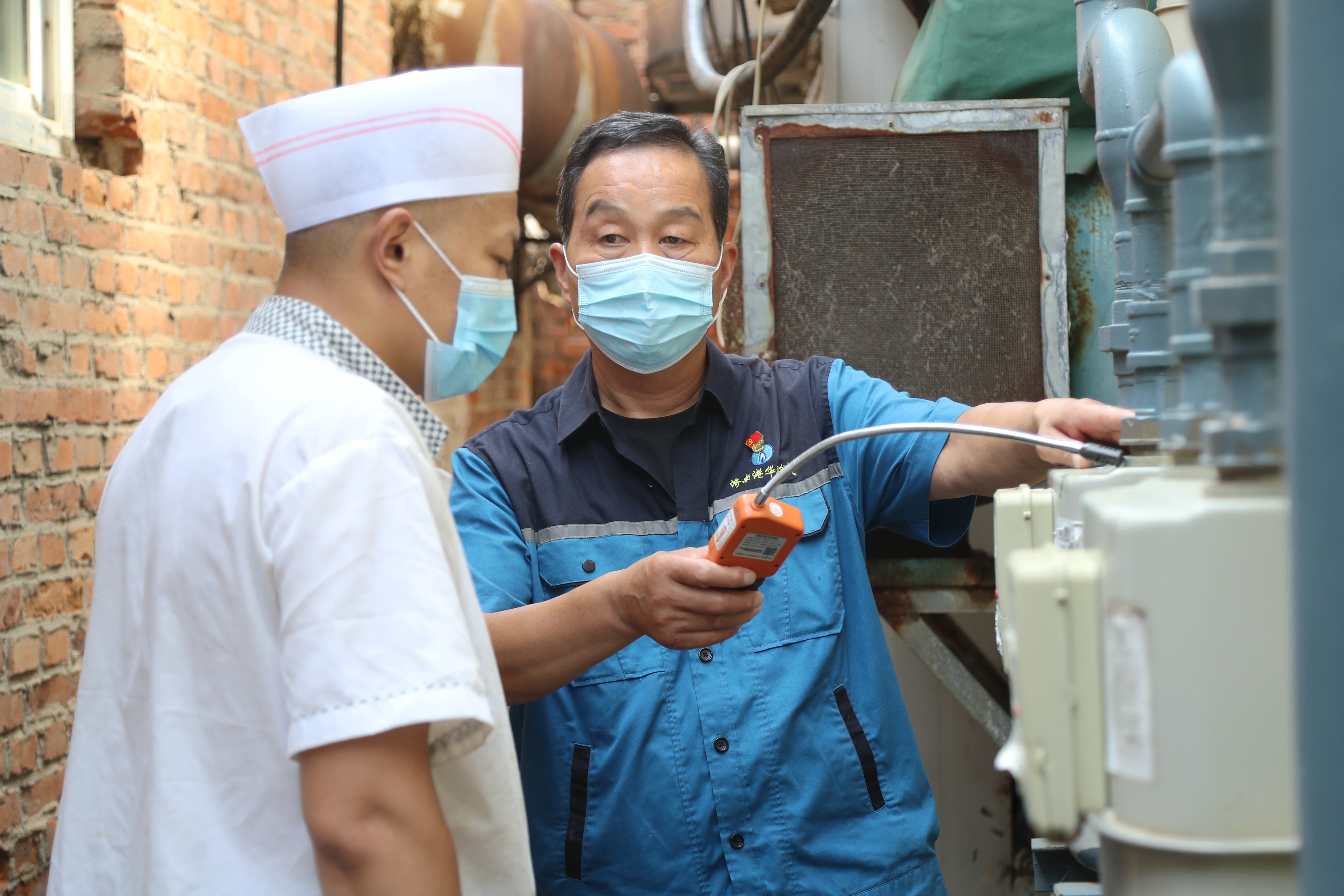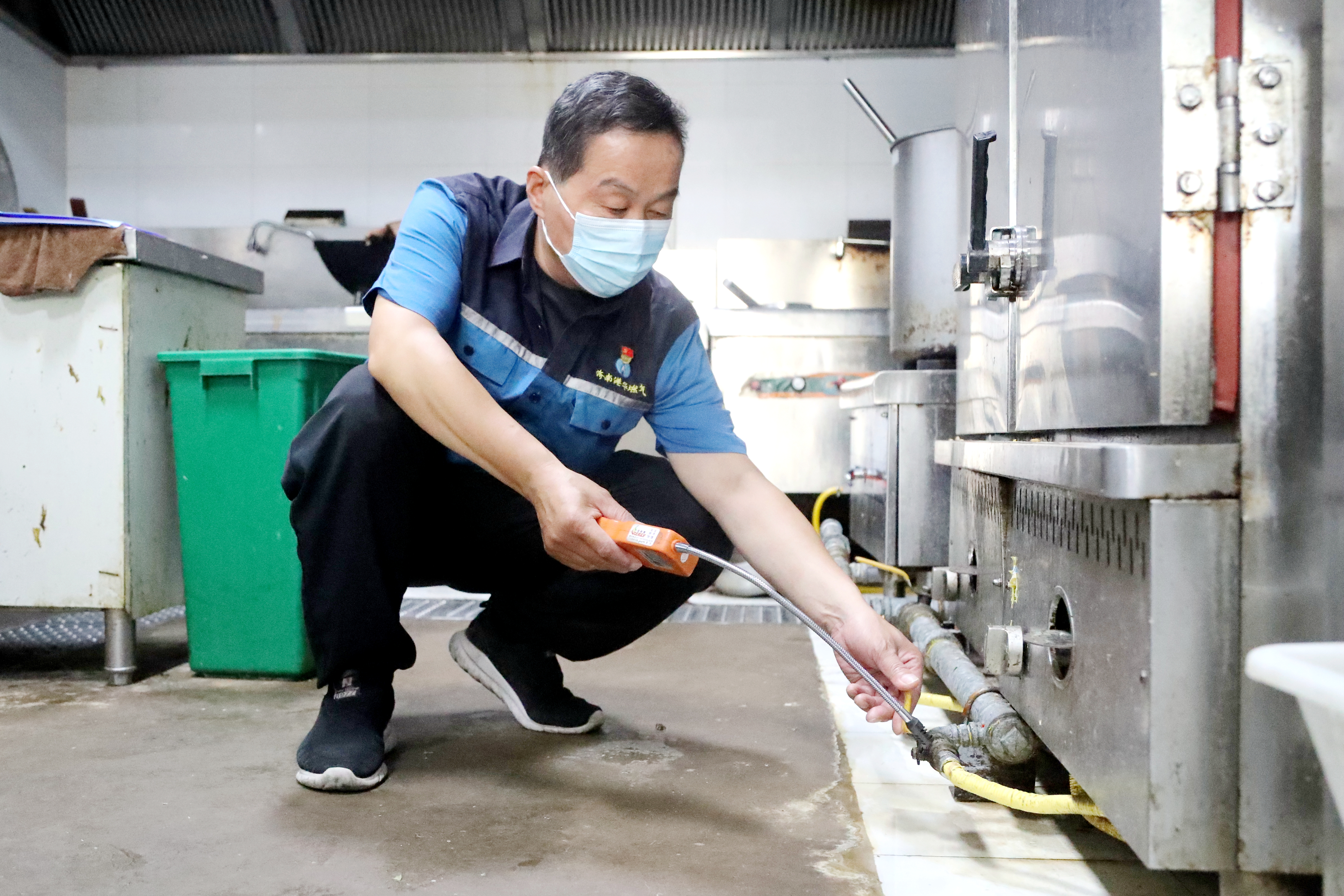 (潘德榮正在對工商餐飲用戶燃氣灶具進行檢查)