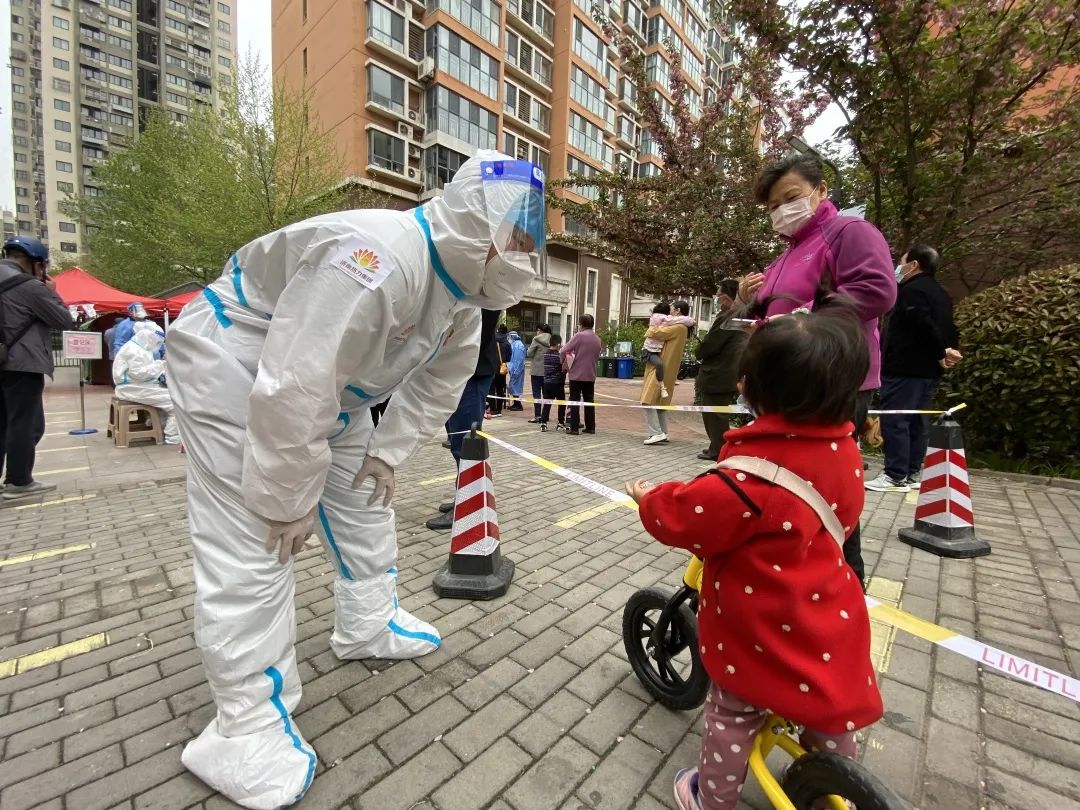 核酸采樣現(xiàn)場一名不到三歲的小女孩因?yàn)楹ε驴摁[起來,志愿者王靖博趕忙上前安撫,并協(xié)助家長順利完成采樣。小女孩將心愛的“萌雞小隊(duì)”貼畫粘在王靖博的胸前表示感謝。