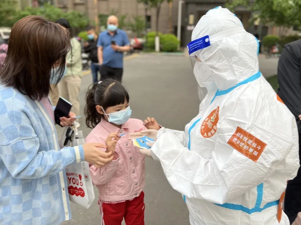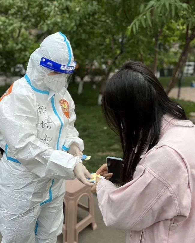 5月6日晚10點(diǎn)左右,剛剛結(jié)束社區(qū)工作,接到了兒子打來的電話。為了方便換下防護(hù)服,她將手機(jī)調(diào)成了免提模式,沒想到,剛一調(diào)好,社區(qū)工作人員跑過來著急地問道:“咱今天的核酸粘貼發(fā)了多少?。?rdquo;一陣慌張的韓培霞立刻將手機(jī)拿起捂住話筒,小聲地對(duì)工作人員說:“1990個(gè),明天上午還要檢測(cè)200個(gè)左右。”