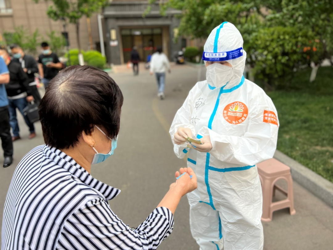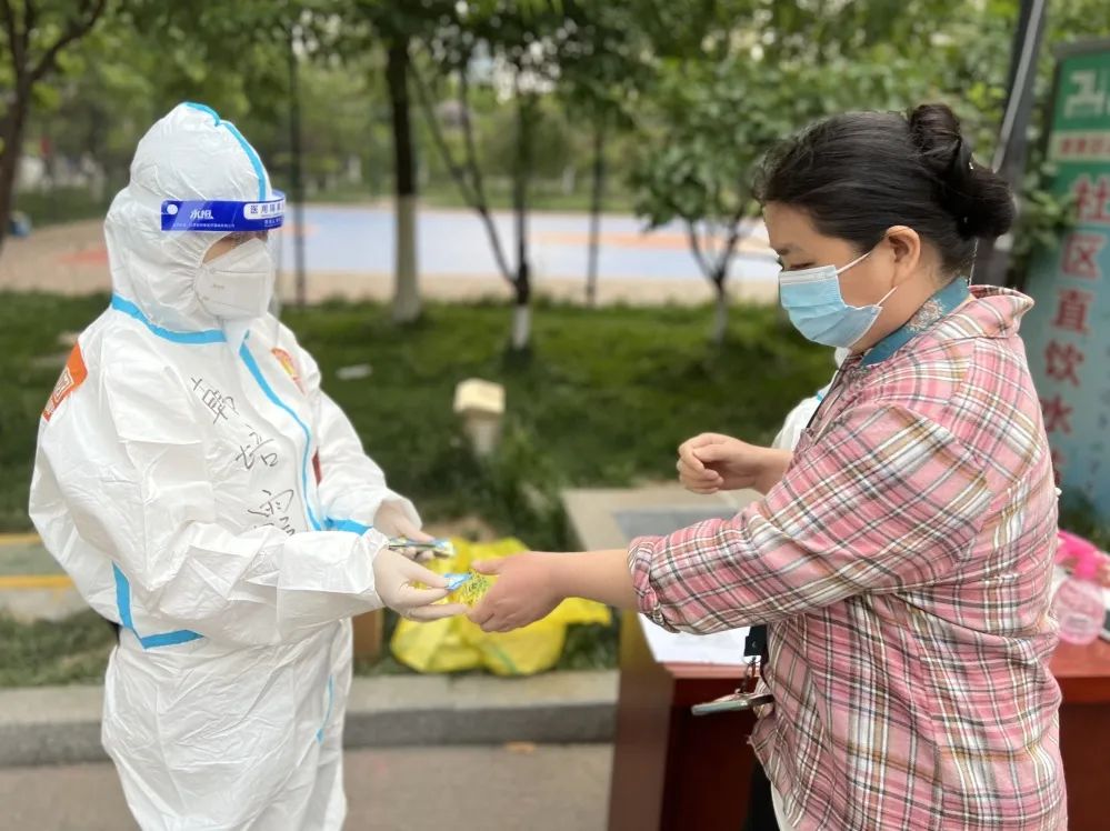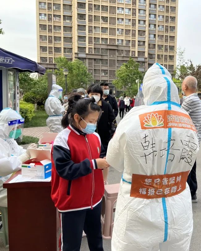 第五批下沉隊(duì)伍組隊(duì)時(shí),韓培霞終于心愿達(dá)成。6日的午后,持續(xù)高溫的濟(jì)南忽然刮起大風(fēng),氣溫驟降,傍晚核酸檢測(cè)時(shí),社區(qū)居民都穿上了厚厚的外套。只穿了一件短袖的韓培霞,被冷風(fēng)吹的不停揉搓胳膊取暖。她身旁的社區(qū)工作人員見狀,急忙回去拿了一件外套讓他穿上,“疫情嚴(yán)峻,可千萬(wàn)別感冒了呀。”她心中涌上濃濃的暖意,一時(shí)竟感動(dòng)地說不出話來。